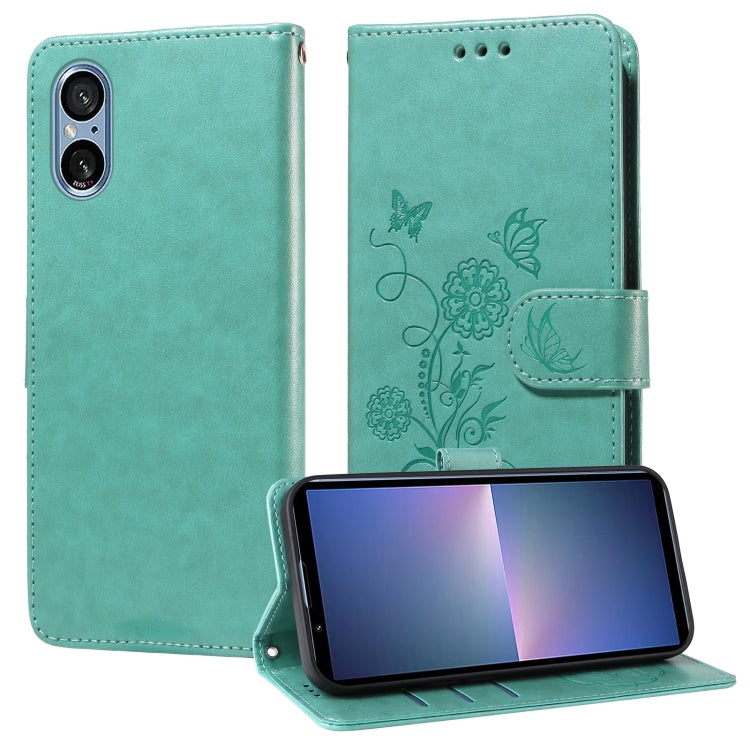 Funda de Cuero Sony Xperia 5 V con Diseño de Mariposas y Flores en Relieve (Verde)