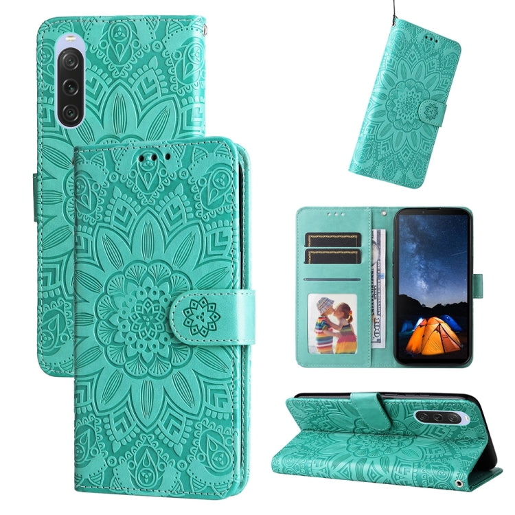 Funda de Cuero para Sony Xperia 10 V con Diseño de Girasol en Relieve (Verde)