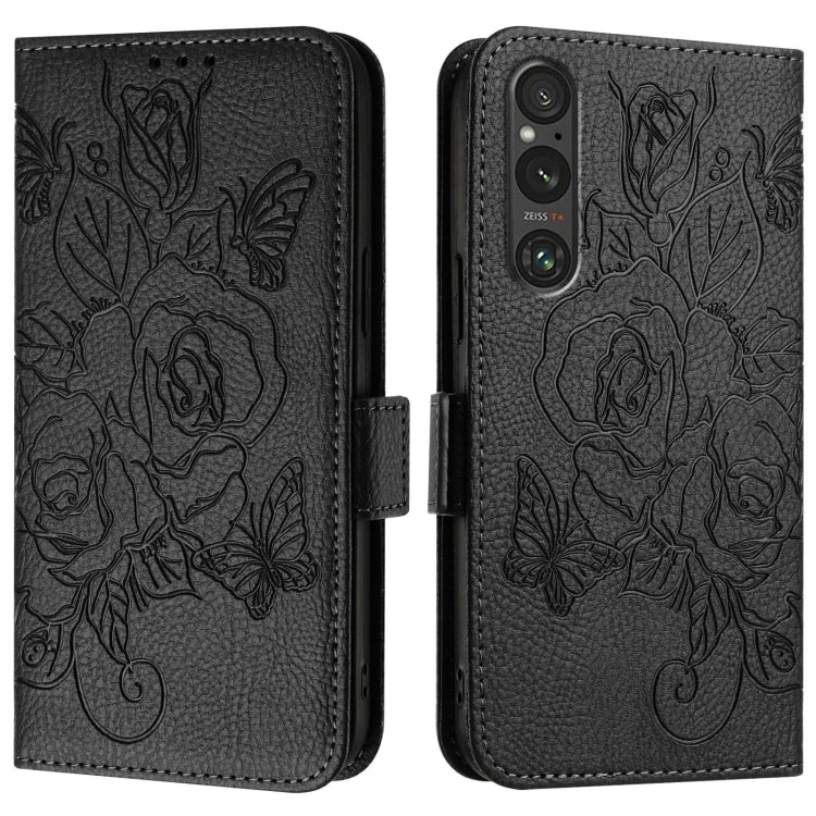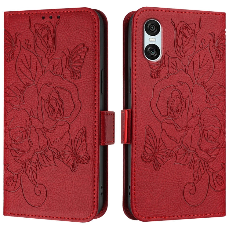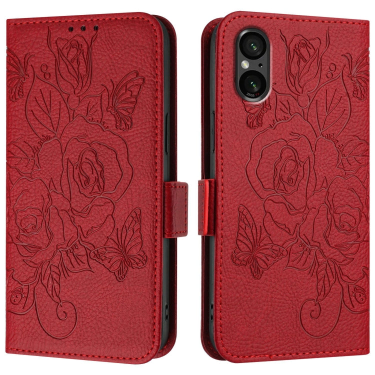 Funda de Cuero Antirrobo RFID para Sony Xperia 5 IV con Relieve de Rosa (Rojo)