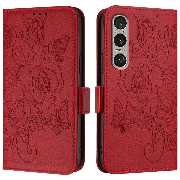 Estuche para Sony Xperia 1 Vi de Cuero Antirrobo Rfid con Rosa En Relieve (Rojo)