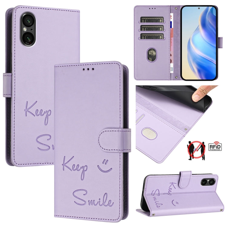 Funda de Cuero Rfid con Relieve Sonriente para Sony Xperia 5 V (Morado Claro)