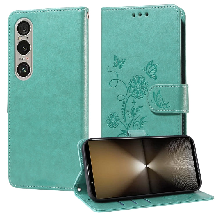 Funda de Cuero Sony Xperia 1 Vi con Diseño de Mariposas y Flores en Relieve (Verde)