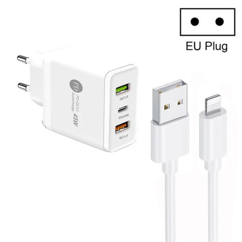 Cargador Usb Multipuerto 45W Pd25W + 2 X Qc3.0 con Cable Usb A 8 Pines (Blanco)