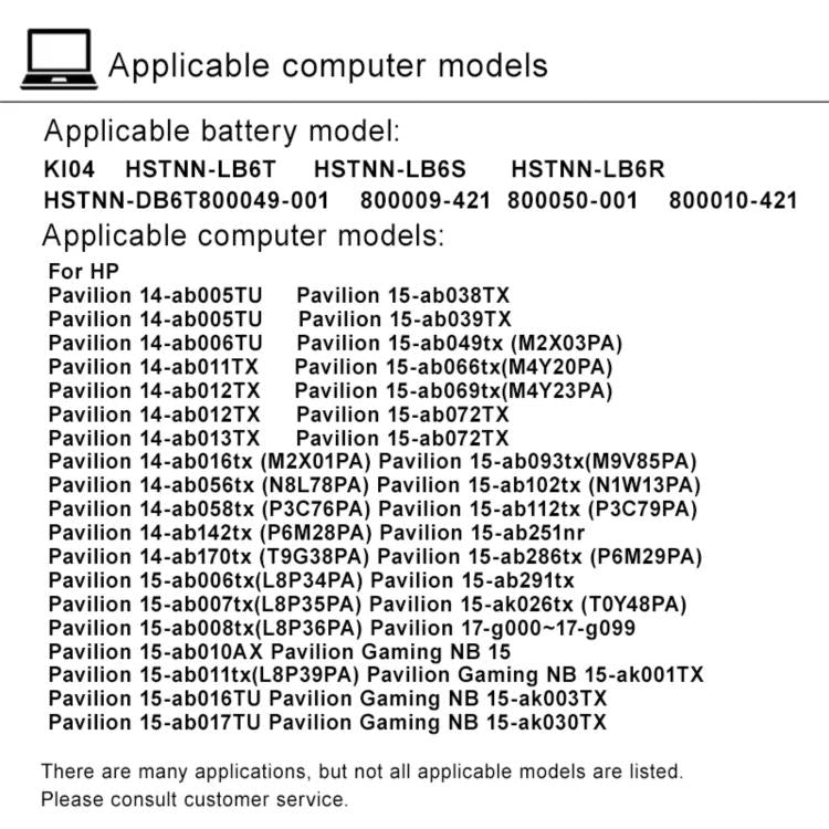 4. Número de pieza de repuesto: KI04, HSTNN-LB6T, HSTNN-LB6S, HSTNN-LB6R, HSTNN-DB6T 800049-001, 800009-421, 800050-001 800010-421s