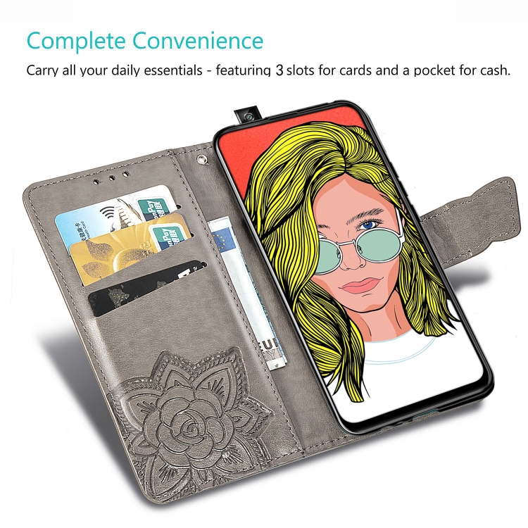 Funda de Cuero Butterfly Love Flowers para Huawei P Smart Z con Tapa Horizontal, Soporte, Ranuras, Billetera y Cordón (Oro Rosa)