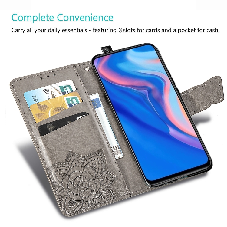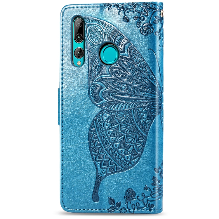 Funda de Cuero Butterfly Love Flowers para Huawei Y9 Prime (2019) con Tapa Horizontal, Soporte, Ranuras para Tarjetas, Billetera y Cordón (Azul)