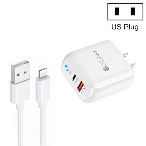 Cargador móvil Pd04 Type-C y USB con cable USB a 8 pines y enchufe EE.UU. (Blanco)