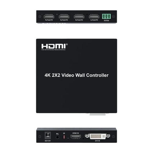 El empalme de video HDMI 4K 2x2 HD con entrada HDMI/DVI y salida HDMI de 4 canales es un dispositivo diseñado para dividir y distribuir Señales de video de alta definición. Compatible con fuentes HDMI y DVI, permite la visualización simultánea en cuatro unidades de Pantalla, como televisores LCD, proyectores o unidades de retroproyección, formando una imagen dinámica grande mediante la función de empalme 2x2. Soporta resoluciones de entrada hasta 4K a 30 Hz y salida en cuatro vías a 1080P a 60 Hz, manteniendo la calidad y proporción de la imagen sin distorsión. Su control remoto y Soporte para control RS232 facilitan la gestión de configuraciones como brillo, contraste y selección de modo. Este equipo es compatible con diversos dispositivos que cuentan con interfaz HDMI o DVI, incluyendo decodificadores, Computadoras de escritorio y Portátiles.
