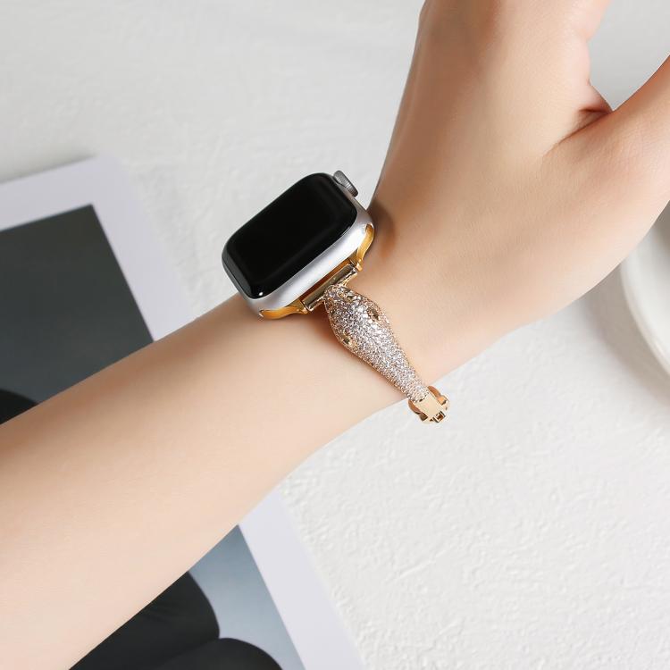 Correa de reloj con cabeza de leopardo y circonitas incrustadas de cobre para Apple Watch de 46 mm, 49 mm, 45 mm y 44 mm (dorada)