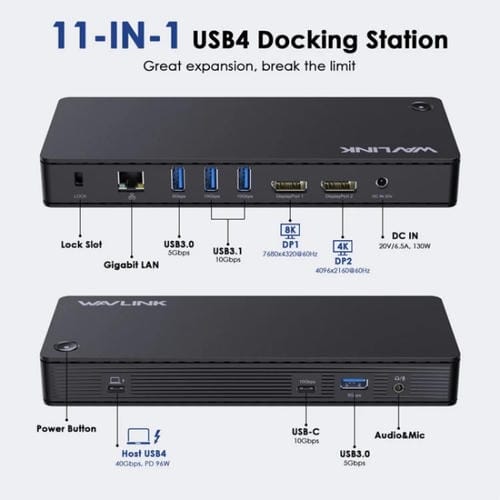 - Incluye 11 Puertos: DisplayPort 8K, DisplayPort 4K, USB 3.1-C de 10 Gbps, USB 3.1-A de 10 Gbps, USB 3.0-A de 5 Gbps, Puerto Gigabit Ethernet, Conector telefónico de 4 polos, ranura para candado y Carga PD IN de 130 W; Soporte para video 8K a 30Hz o dual 4K a 60Hz; transferencia de datos hasta 40 Gbps; Enchufe australiano