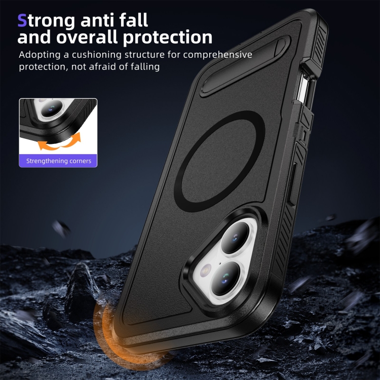 Estuche híbrido TPU y PC con soporte Magsafe para iPhone 16 (Negro)