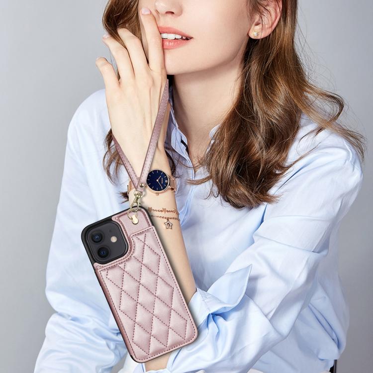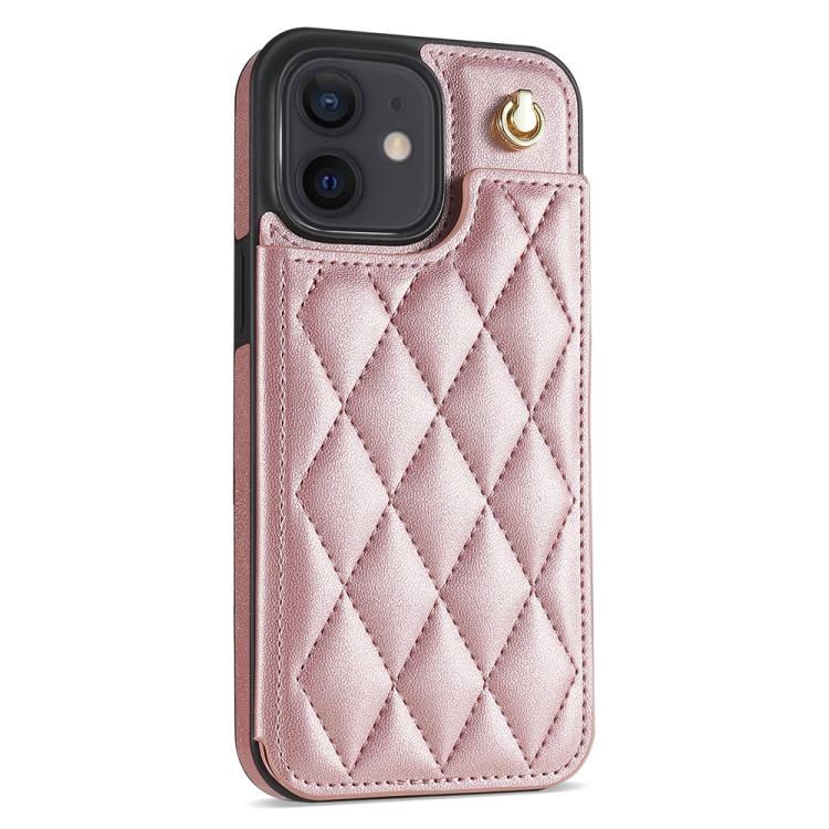 Estuche para Teléfono Rombal iPhone 12/12 Pro Ranuras Tarjetas Hebilla Doble Cordón (Oro Rosa)