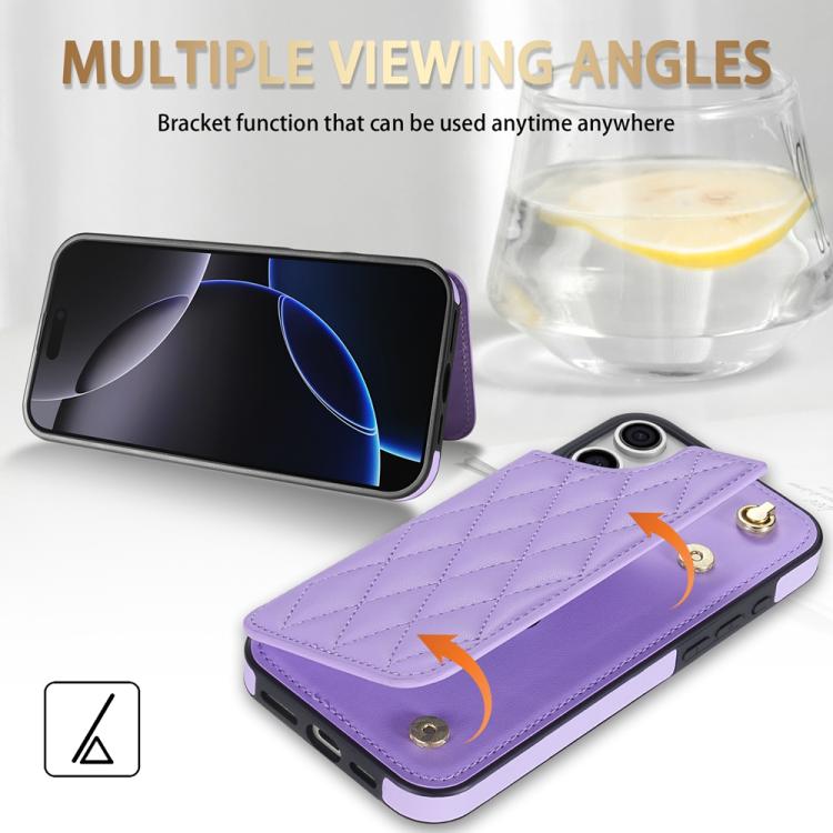 Estuche para Teléfono iPhone 14 Pro con Ranuras para Tarjetas y Hebilla Doble Rombal con Cordón (Morado)