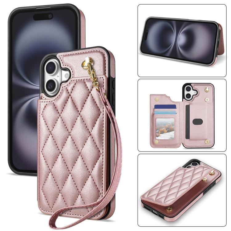 Estuche para Teléfono iPhone 16 con Ranuras para Tarjetas y Hebilla Doble Rombal con Cordón (Oro Rosa)