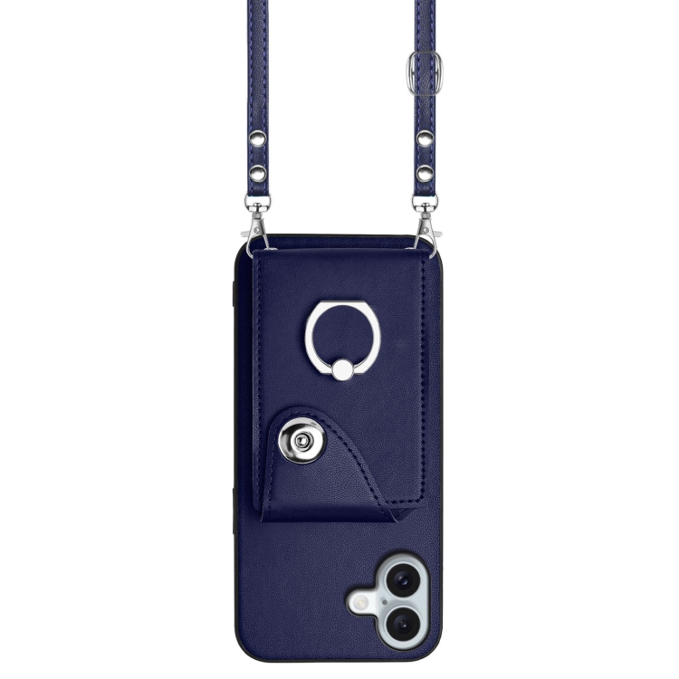 Estuche para Teléfono iPhone 16 Plus Soporte Tarjetas Anillo Cordón Largo (Azul)