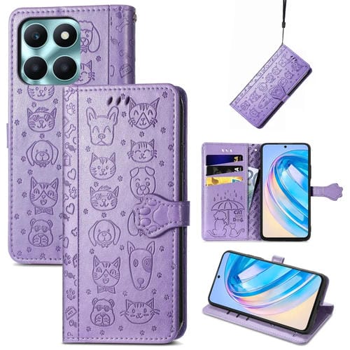 Funda para Teléfono For Honor X6A Cuero con Relieve de Perro y Gato (Púrpura)