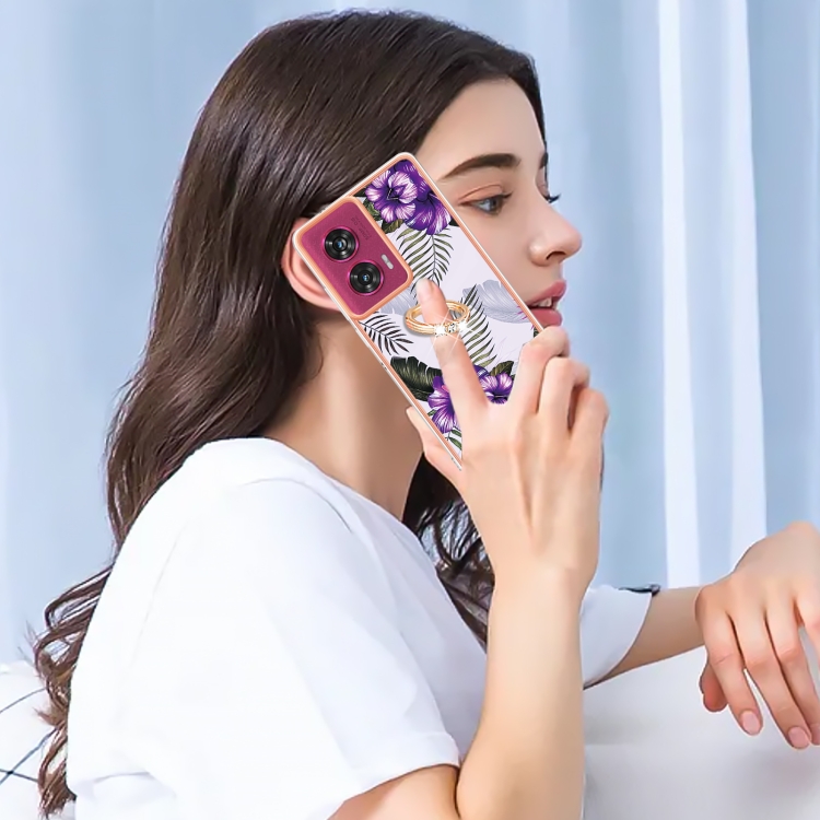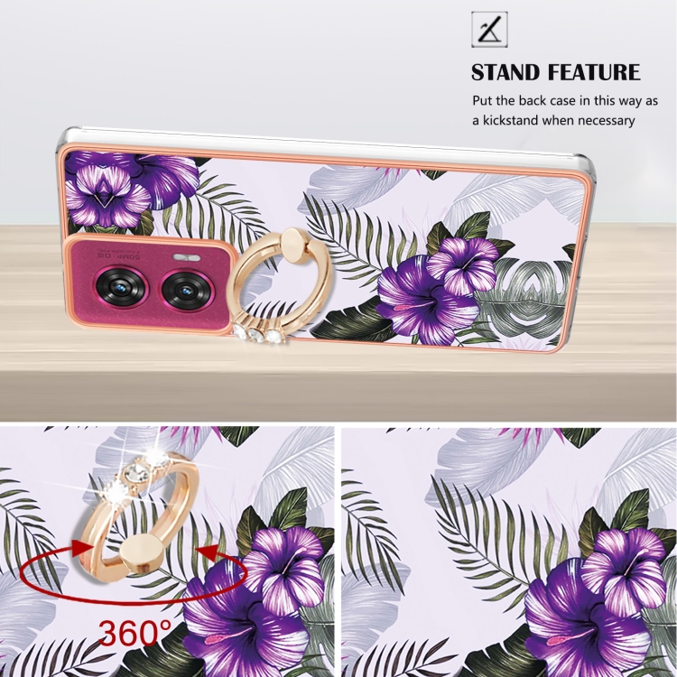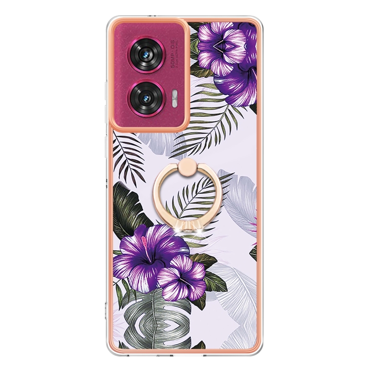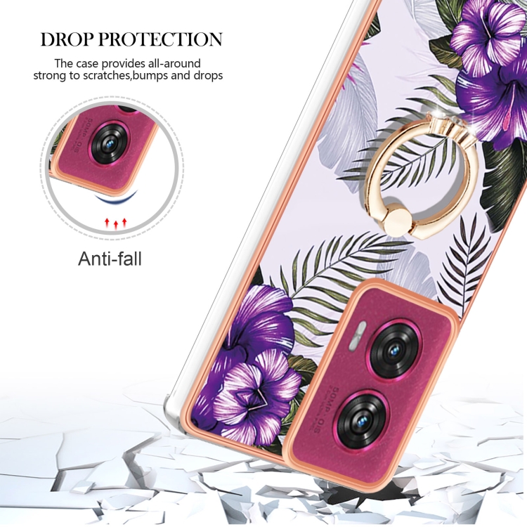 Funda TPU a Prueba de Golpes con Patrón Galvanoplastia Imd para Motorola Edge 50 Fusion con Soporte Anillo (Flor Morada)