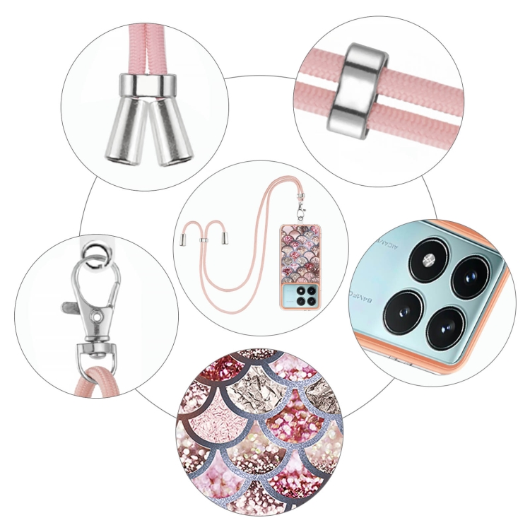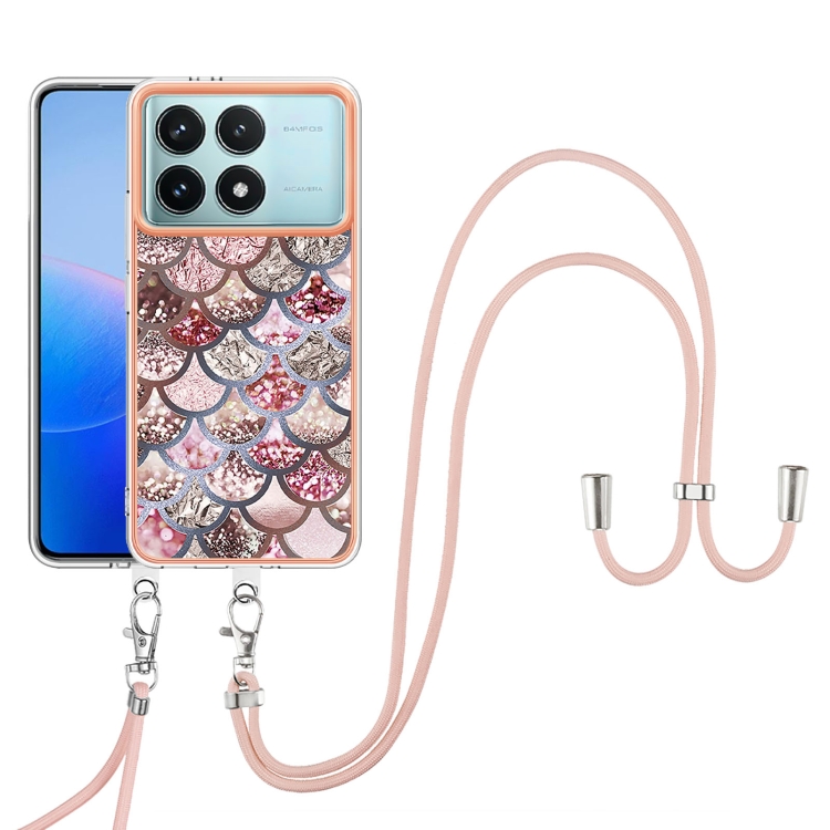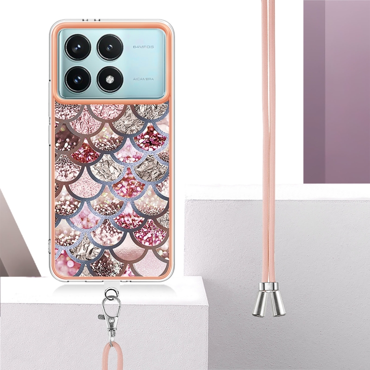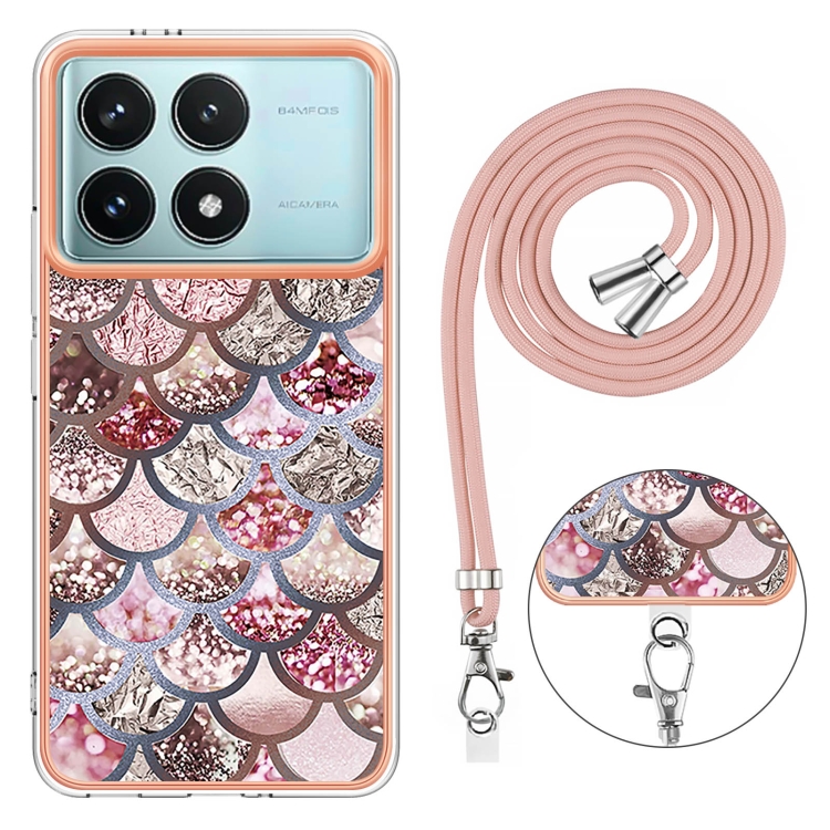 Funda a Prueba de Golpes con Patrón de Galvanoplastia Imd TPU para Xiaomi Poco F6 Pro 5G con Cordón para El Cuello (Escamas Rosas)