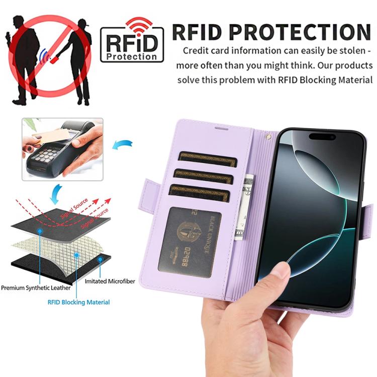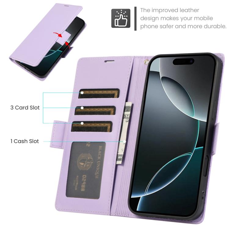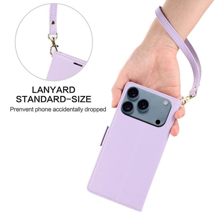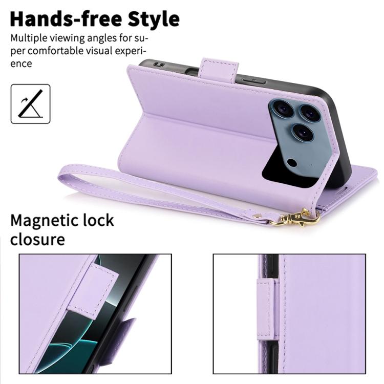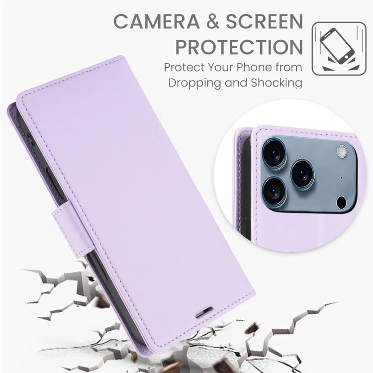 Funda de cuero antirrobo RFID con hebilla lateral para iPhone 17 Pro (morado claro)