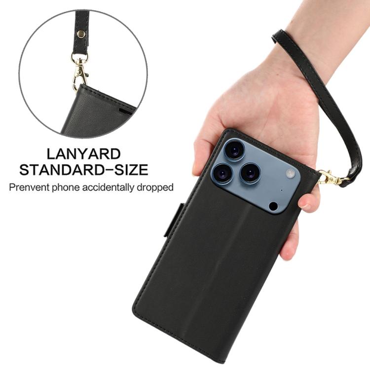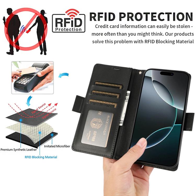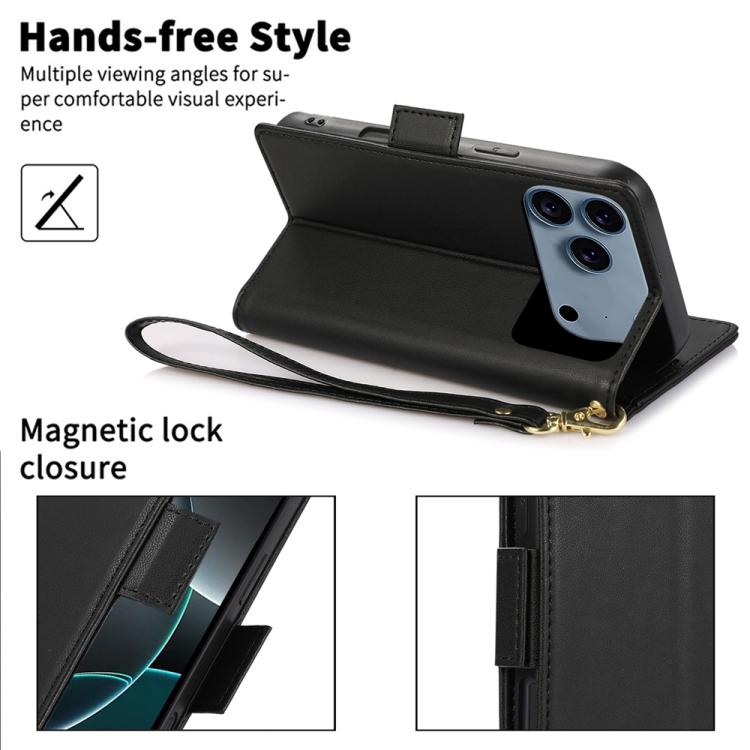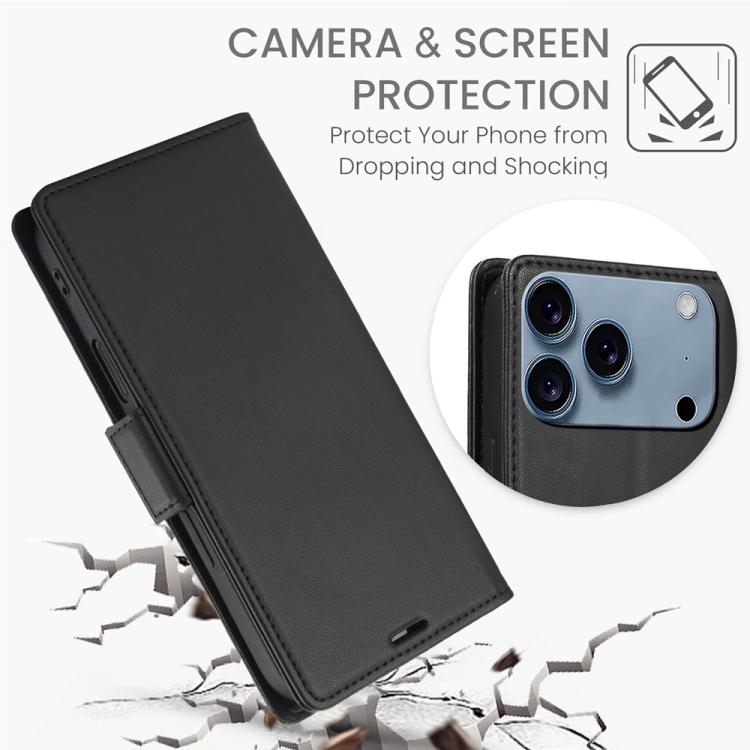Funda de cuero antirrobo RFID con hebilla lateral para iPhone 17 Pro (negra)