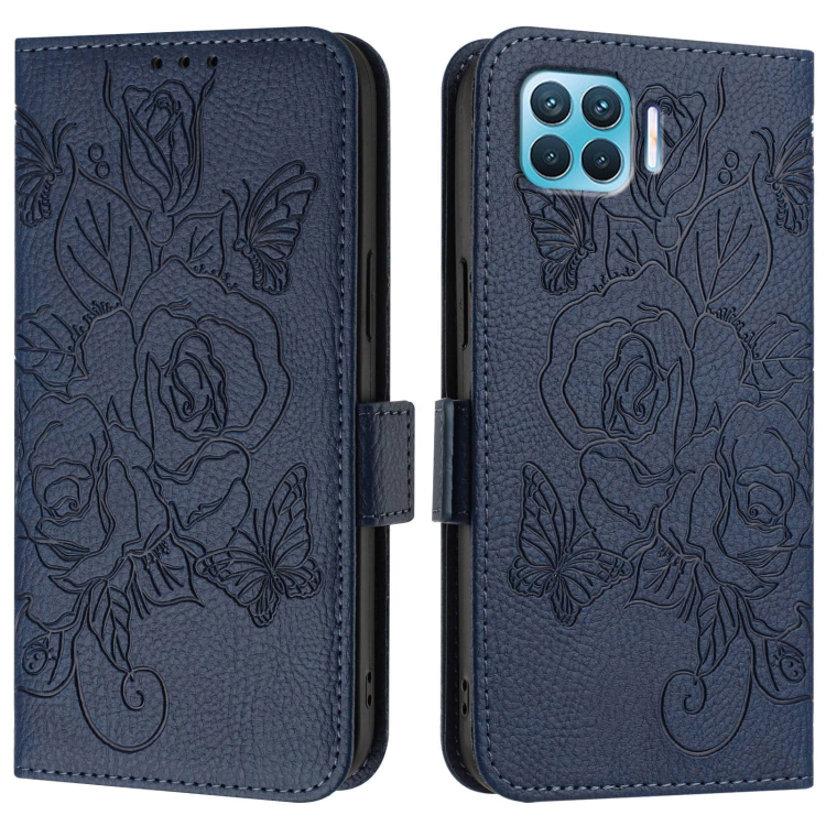 Funda de Cuero Antirrobo Rfid con Relieve En Rosa para Oppo Reno4 Lite/Reno4 F (Azul Oscuro)