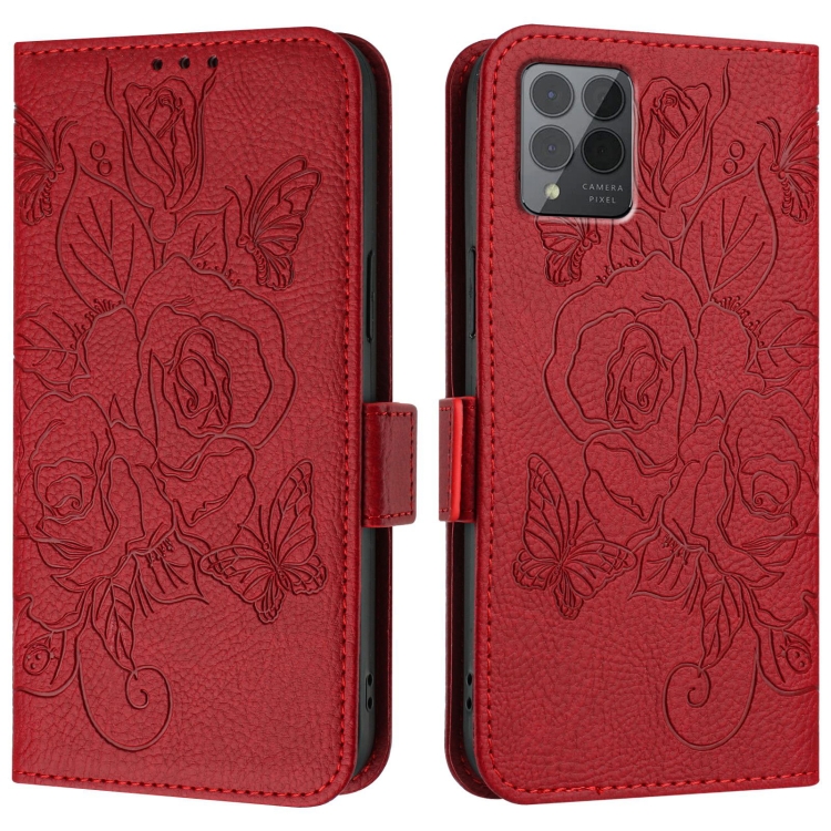 Funda de Cuero Antirrobo RFID con Relieve para Teléfono T-Mobile Revvl 6 Pro / 6X Pro 5G (Rojo)