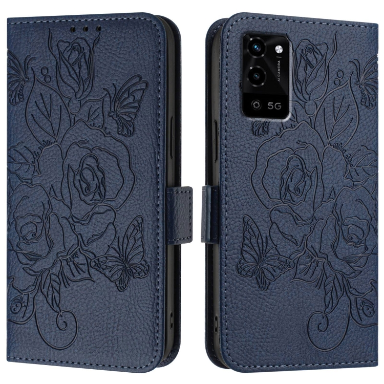 Funda de Cuero Antirrobo Rfid con Relieve Rosa para Oppo A54 4G / A54S / A55 5G / A16 (Azul Oscuro)