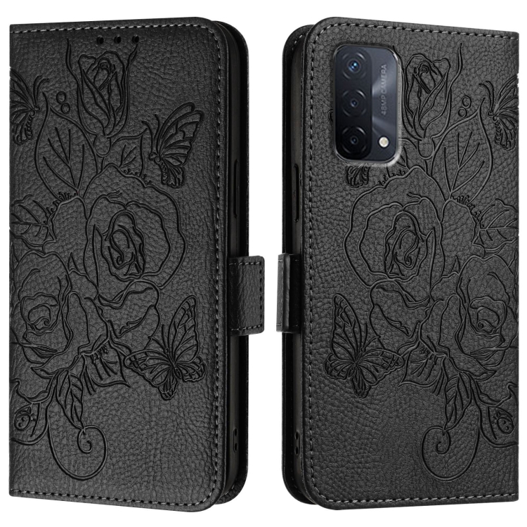 Funda de Cuero Antirrobo Rfid con Relieve Rosa para Oppo A54 5G / A74 5G / A93 5G (Negra)