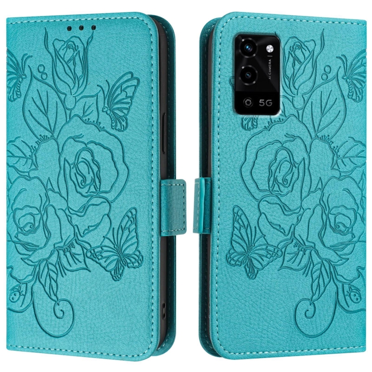 Funda de Cuero Antirrobo Rfid con Relieve Rosa para Oppo A55S 5G / A53S 5G / A56 5G / A16S (Azul Claro)