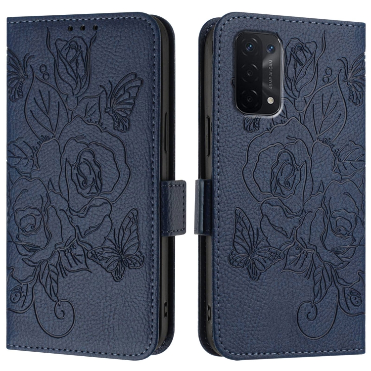 Funda de Cuero Antirrobo Rfid con Relieve Rosa para Oppo A77 5G / A97 5G / Realme V23 (Azul Oscuro)