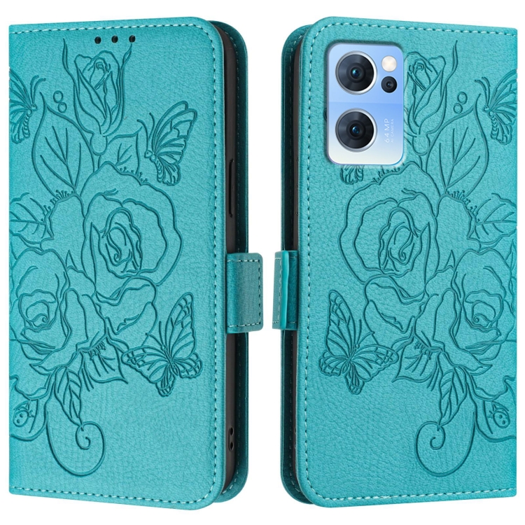Funda de Cuero Antirrobo Rfid con Relieve Rosa para Oppo Reno7 5G Global/Find X5 Lite (Azul Claro)