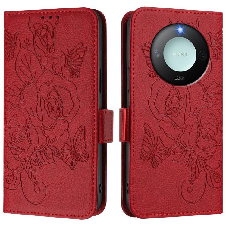 Funda de Cuero Antirrobo RFID con Relieve Rosa para Honor X9C 5G (Rojo)