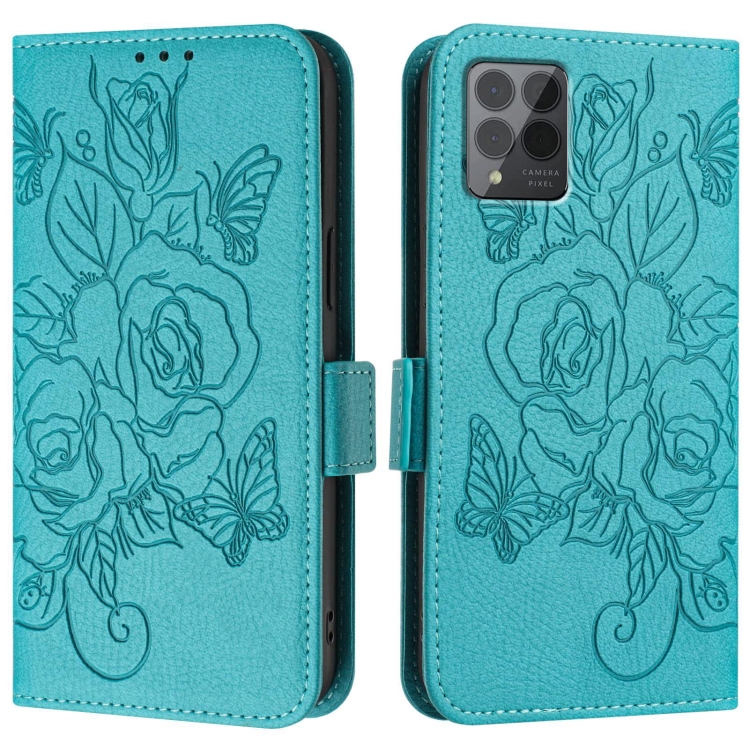 Funda de Cuero Antirrobo RFID con Relieve Rosa para T-Mobile Revvl 6 Pro / 6X Pro 5G (Azul Claro)