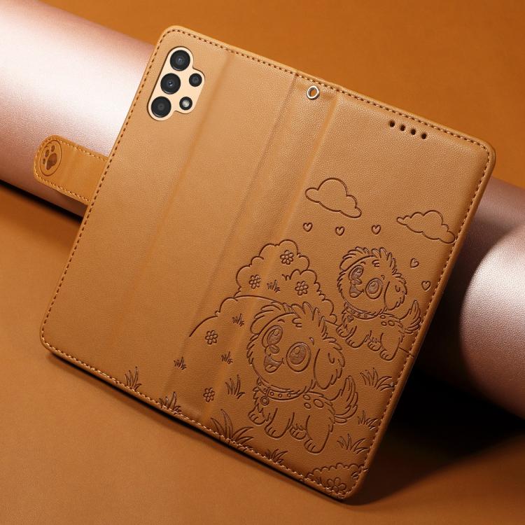 Funda de cuero con bloqueo RFID para Samsung Galaxy A13 4G/5G, con diseño de corazón en relieve y perro (marrón)