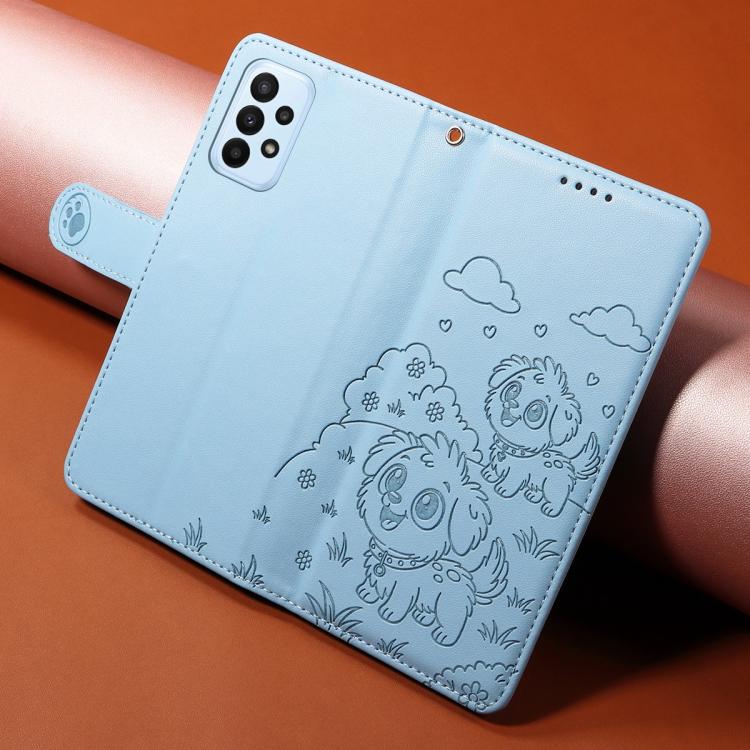 Funda de cuero con bloqueo RFID para Samsung Galaxy A23 4G/5G, con diseño de corazón y perro en relieve (azul cielo)
