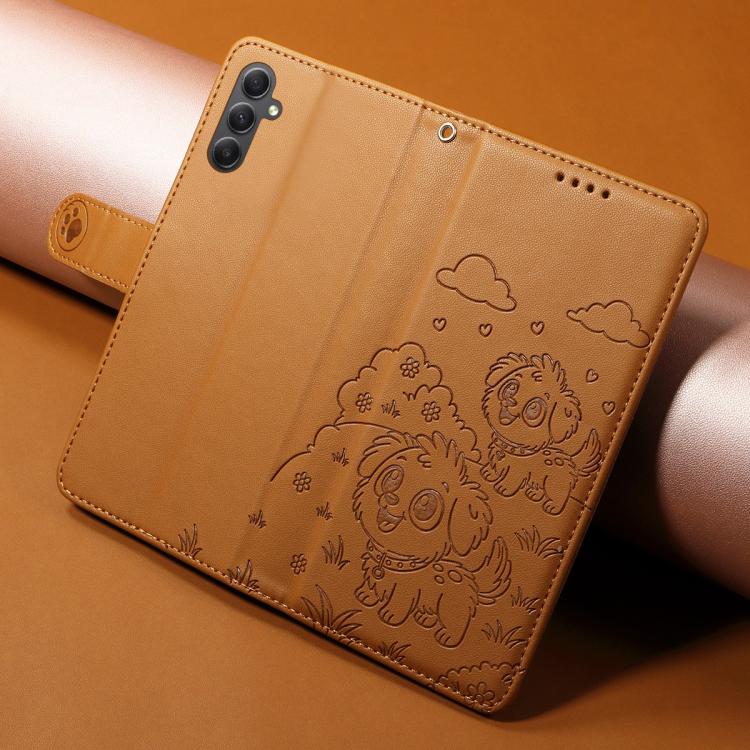 Funda de cuero con bloqueo RFID para Samsung Galaxy A34 5G, con diseño de corazón y perro en relieve (marrón)