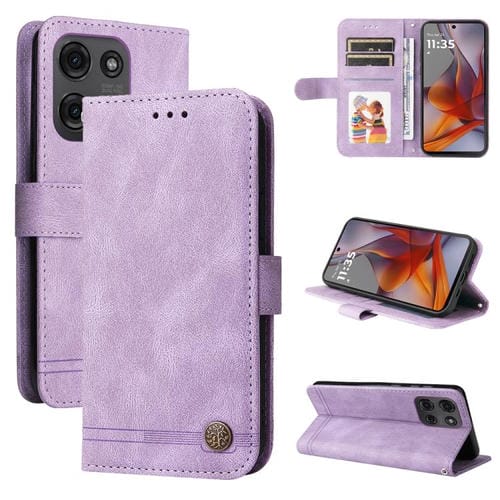 Funda de Cuero Motorola Moto G75 5G con Botones de Metal y Diseño Árbol de la Vida (Morado)