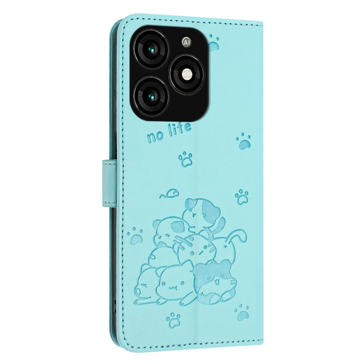 Funda de Cuero con Cordón para Teléfono Itel A70 con Diseño de Gatito en Relieve (Verde Menta)