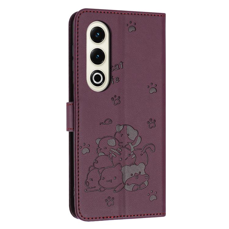 Funda de Cuero con Cordón para Teléfono Itel S25 con Gatito en Relieve (Rojo Vino)
