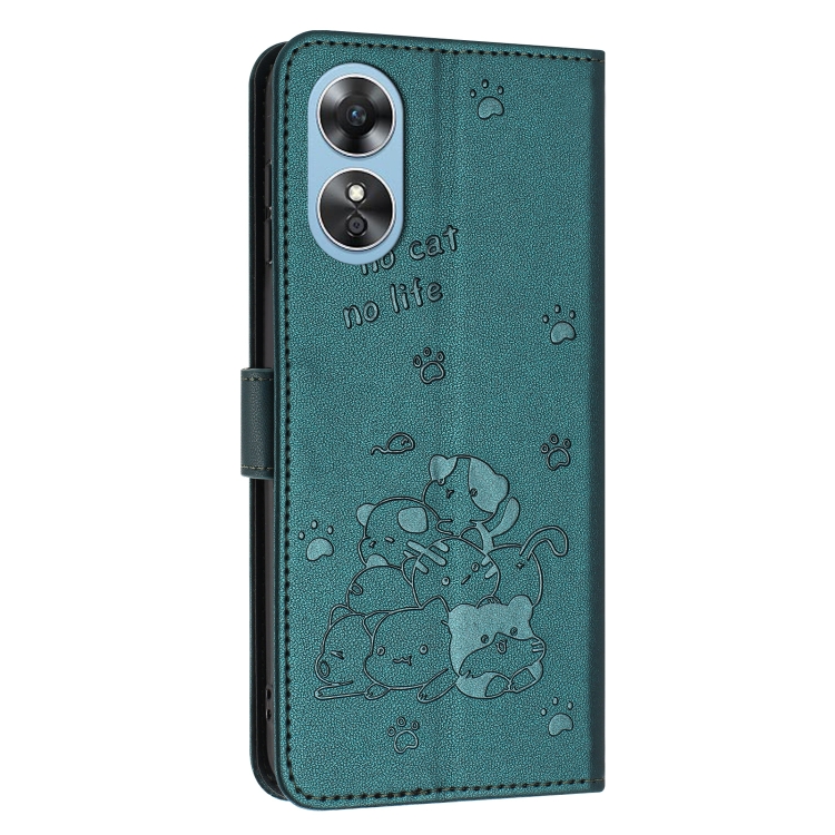 Funda de Piel con Diseño de Gatito En Relieve para Oppo A17 4G Global con Cordón (Verde Oscuro)