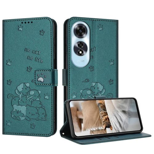 Funda de Piel con Diseño de Gatito En Relieve para Oppo A60 4G (Verde Oscuro)