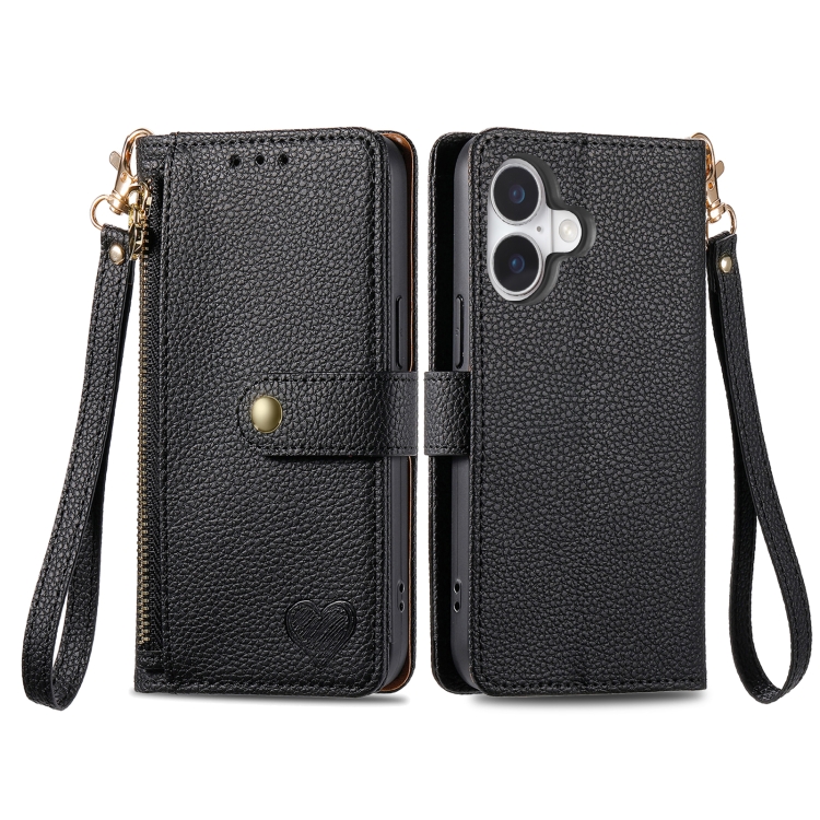 Funda de Cuero con Cordón y Cremallera Love para iPhone 16 Plus (Negra)
