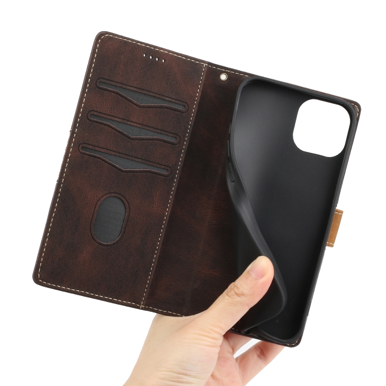 Funda de Cuero para iPhone 15 con Costuras de Cuadrícula y Cordón (Marrón)