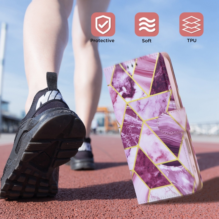 Funda de Cuero con Costuras en Bronce y Mármol para iPhone 16 Plus (Morado)