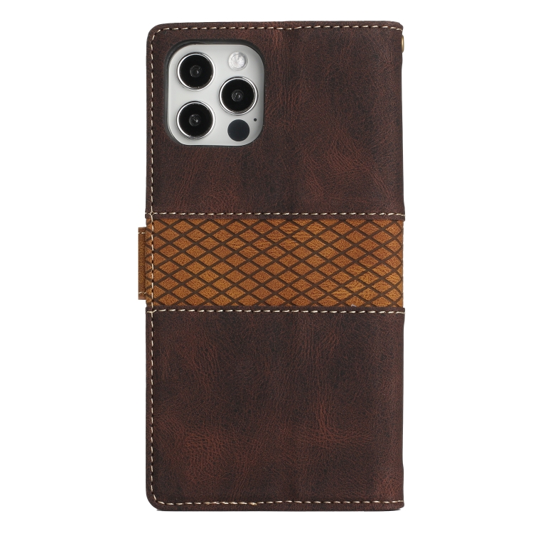 Funda de Cuero para iPhone 12/12 Pro con Cordón y Costuras en Cuadrícula (Marrón)
