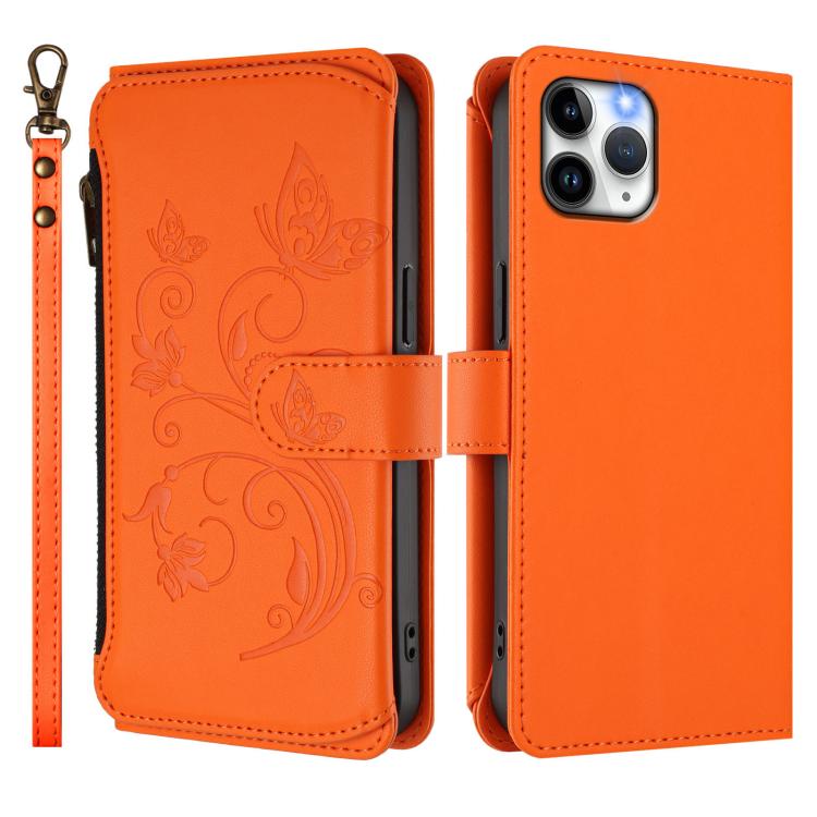 Funda de cuero con cremallera para iPhone 11 Pro Max, diseño de mariposas, flores y amor (naranja)