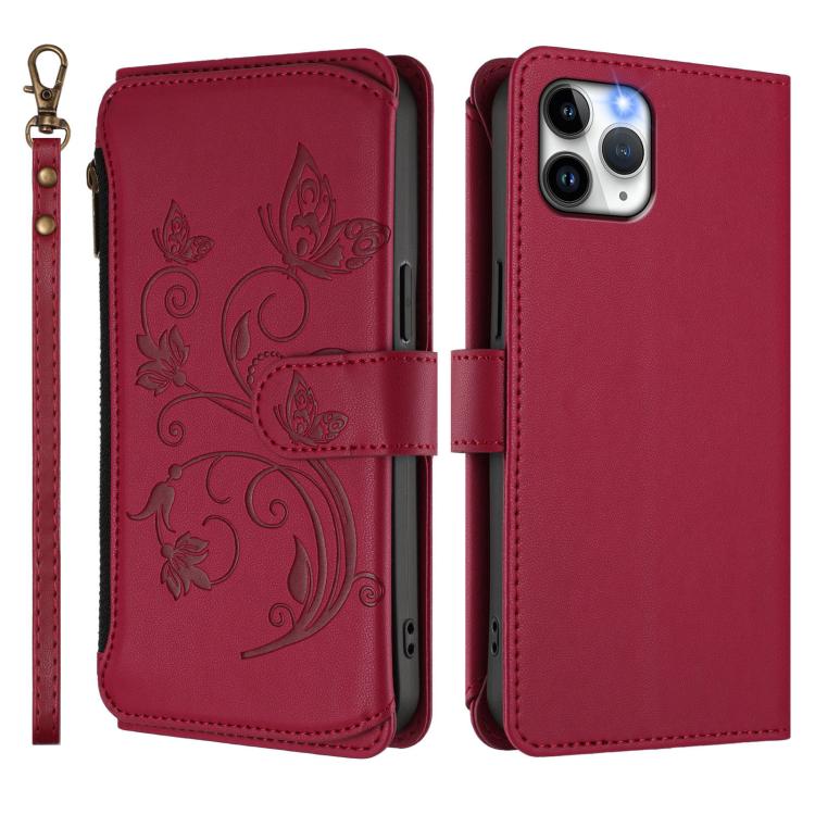 Funda de cuero con cremallera para iPhone 11 Pro Max, diseño de mariposas, flores y amor (rojo vino)