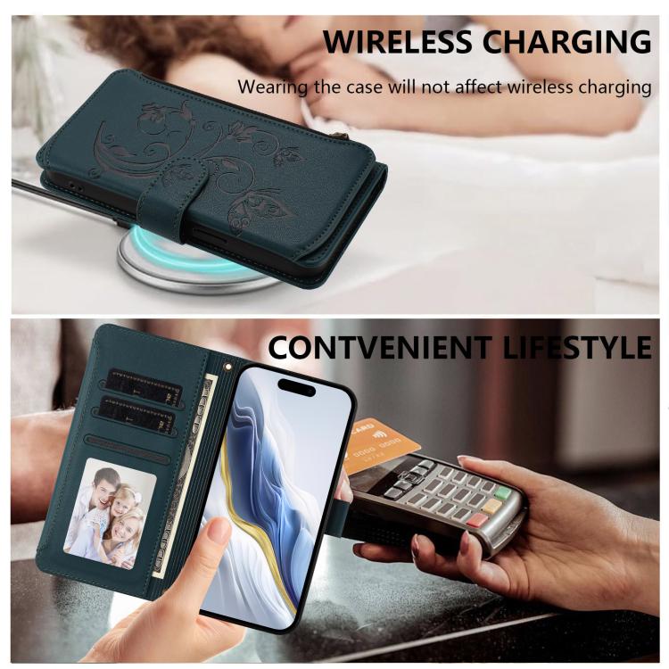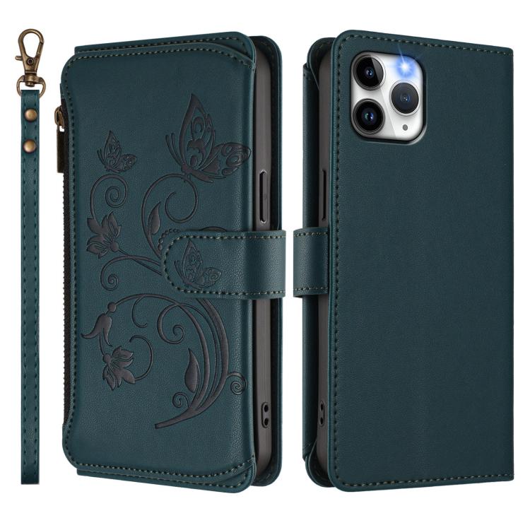 Funda de cuero con cremallera para iPhone 11 Pro Max, diseño de mariposas, flores y amor (verde oscuro)