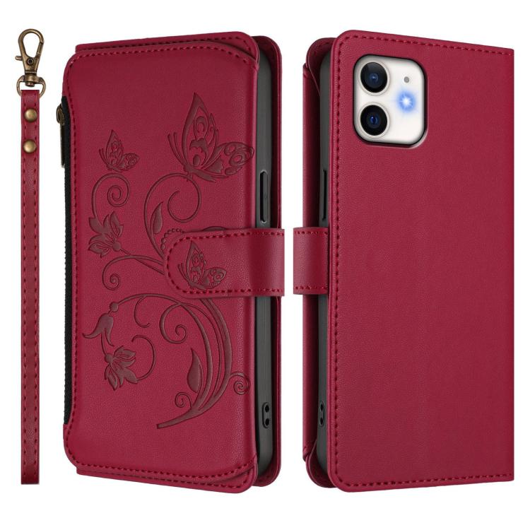 Funda de cuero con cremallera para iPhone 12 mini, diseño de mariposas, flores y amor, con múltiples tarjetas (rojo vino)
