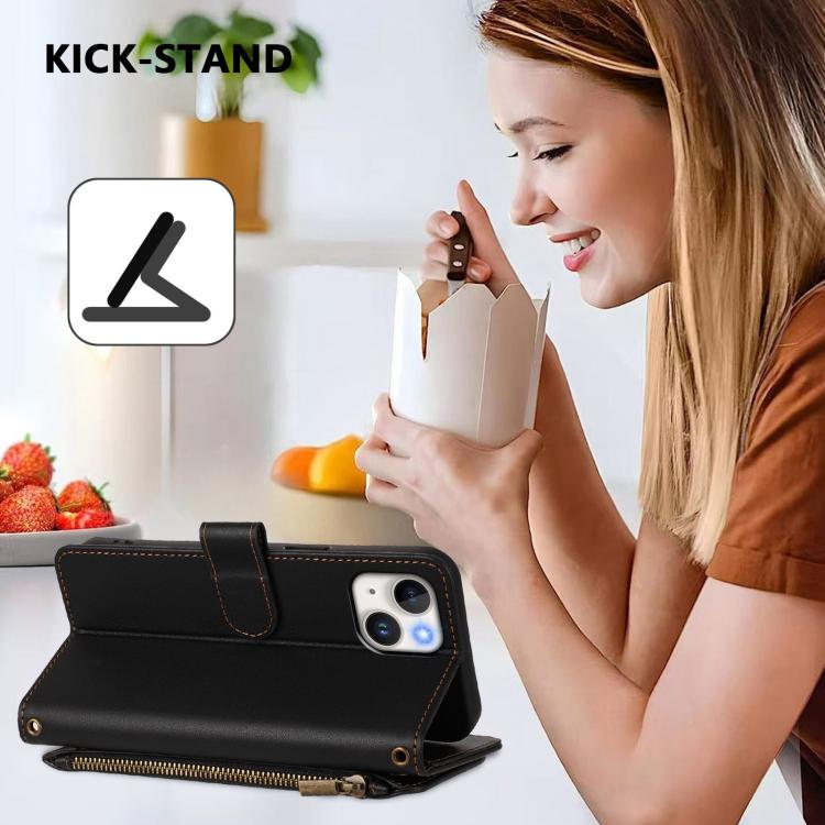 Funda de cuero con cremallera para iPhone 14/13, diseño de mariposas, flores y amor, con múltiples tarjetas (negro)